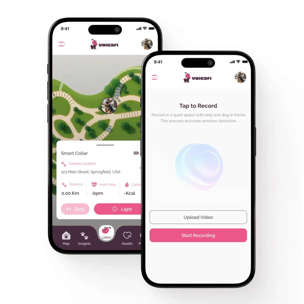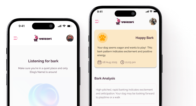 Voicari decodes emotions through AI-powered analysis of barking and vital signs. It bridges the emotional gap, strengthens trust, and prevents misunderstandings — all in real time.
